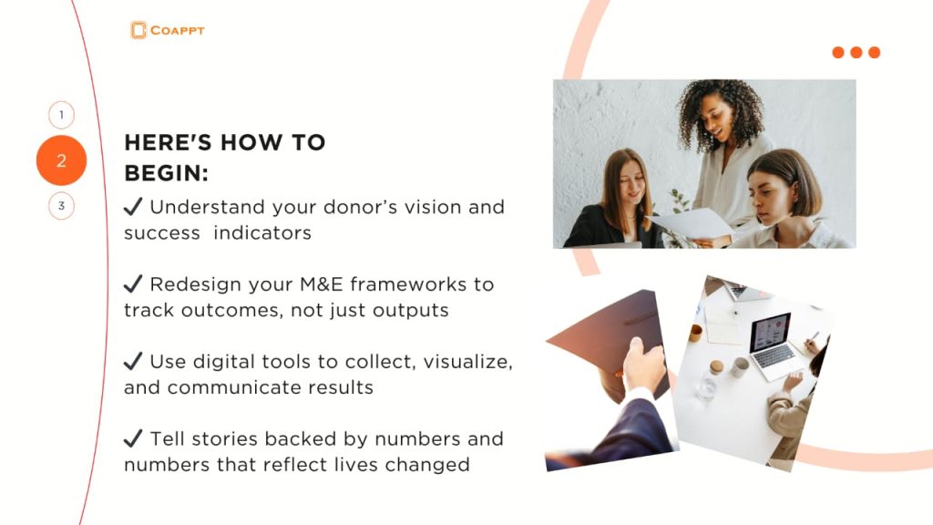 ✔ Redesign your M&E frameworks to track outcomes, not just outputs